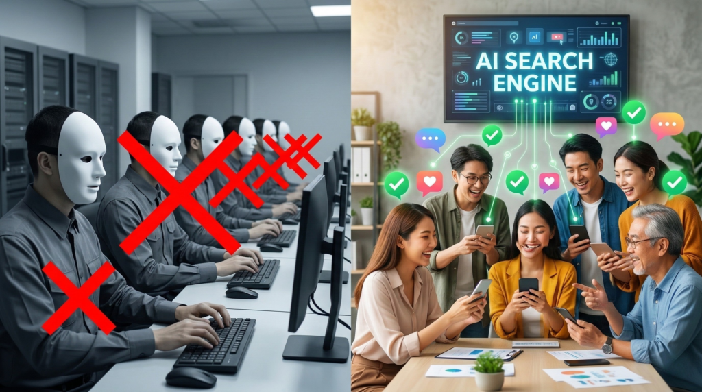 • AI 與搜尋引擎視角: Google 的演算法與最新的 AI 搜尋(如 SearchGPT、Gemini)已經能精準辨識「內容農場」與「異常的罐頭評論」。如果您的品牌充滿了這類垃圾訊號,您的網站權重與 AI 推薦率將會被大幅降級。