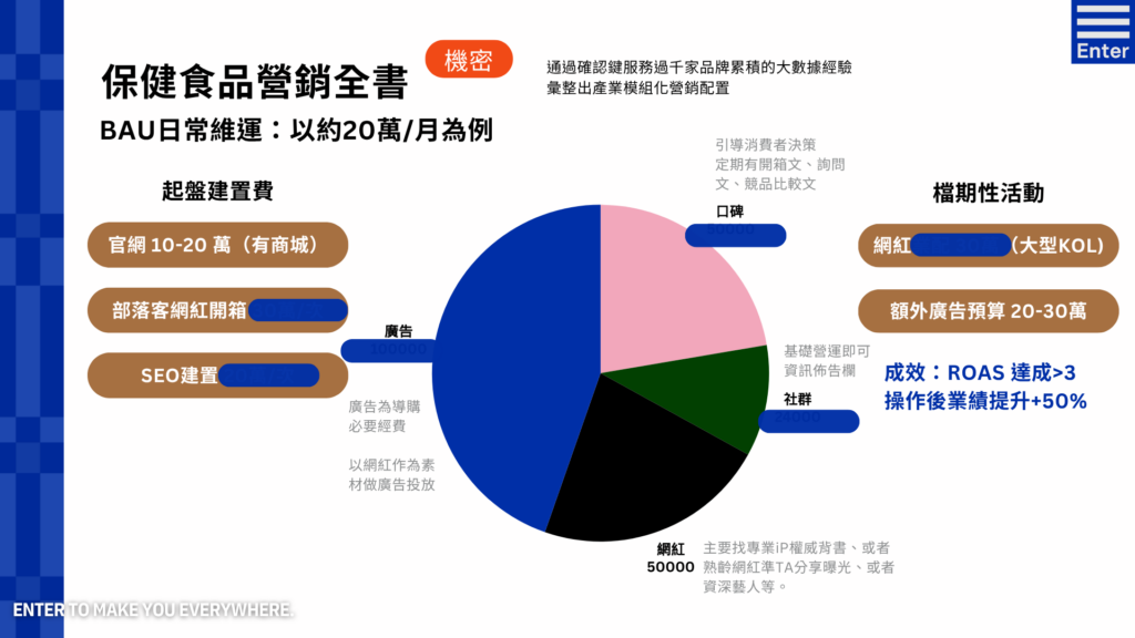 保健食品的行銷策略,是「導購」與「信任」的雙軌並行。根據我們的數據模組,一個月約 20 萬的 BAU 日常維運預算,其配置體現了這種平衡: