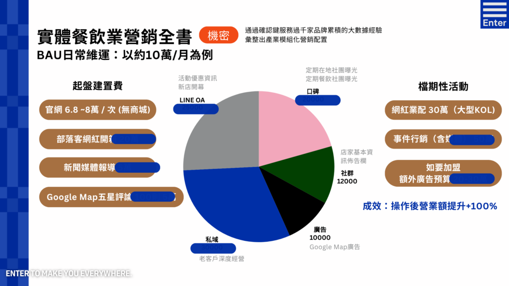 有別於電商的高額廣告預算,根據我們的模組 ,餐飲業的月預算(約 10 萬)必須花在刀口上。本文將拆解,如何透過精準的預算配置,操作「Google Map 評論」、「LINE OA」與「在地社團」,實現「操作後營業額提升 +100%」的驚人成效。