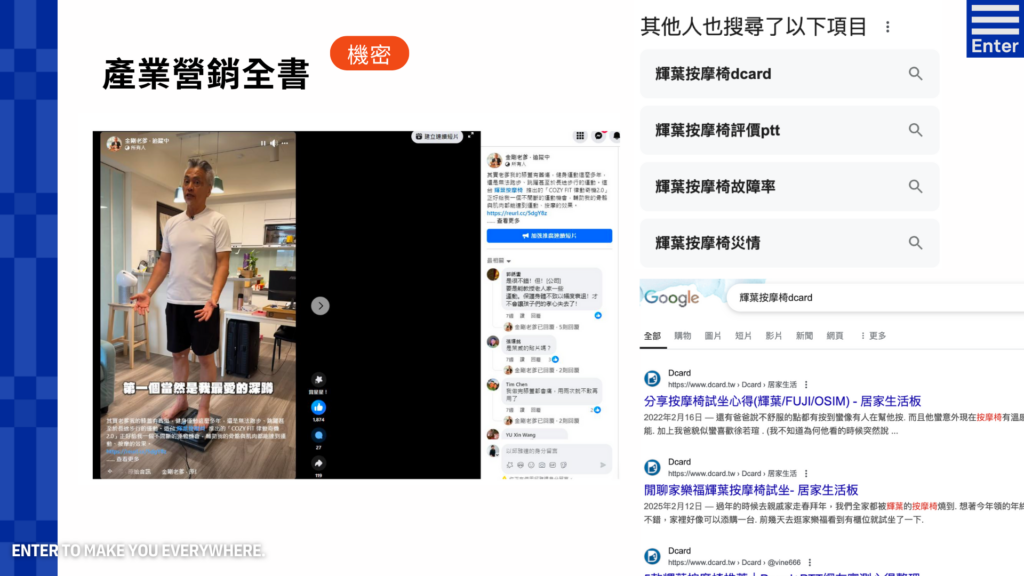 - 詢問文操作: 在 Dcard 居家生活板、PTT E-appliance 板,模擬真實情境提問(如:輝葉按摩椅評價、故障率)。